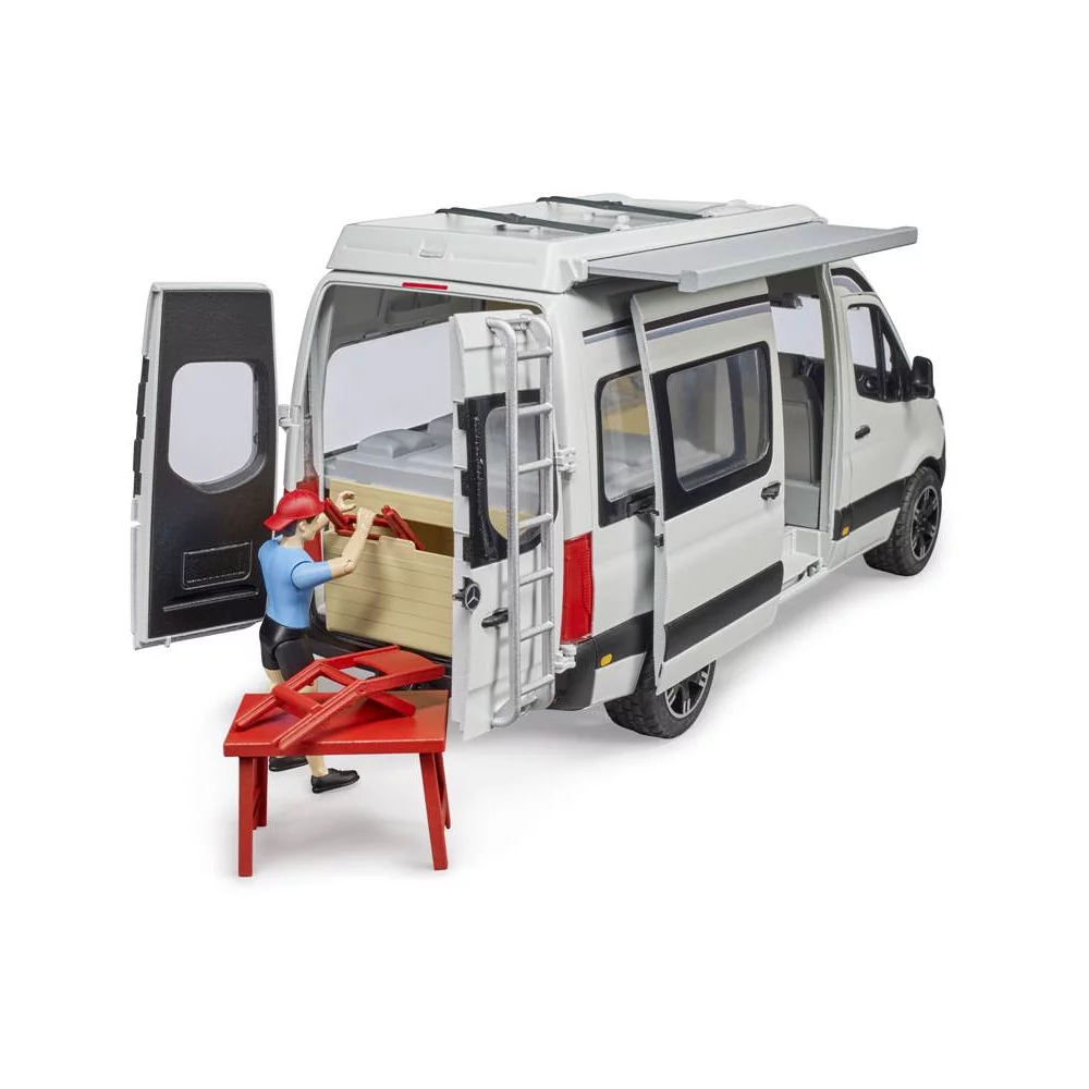 - Il camper Mercedes Benz Sprinter, prodotto da Bruder, è dotato di un letto matrimoniale e un fornello all'interno. Inoltre, il camper dispone di una tenda da sole estensibile. Con questo articolo di alta qualità il divertimento è garantito.