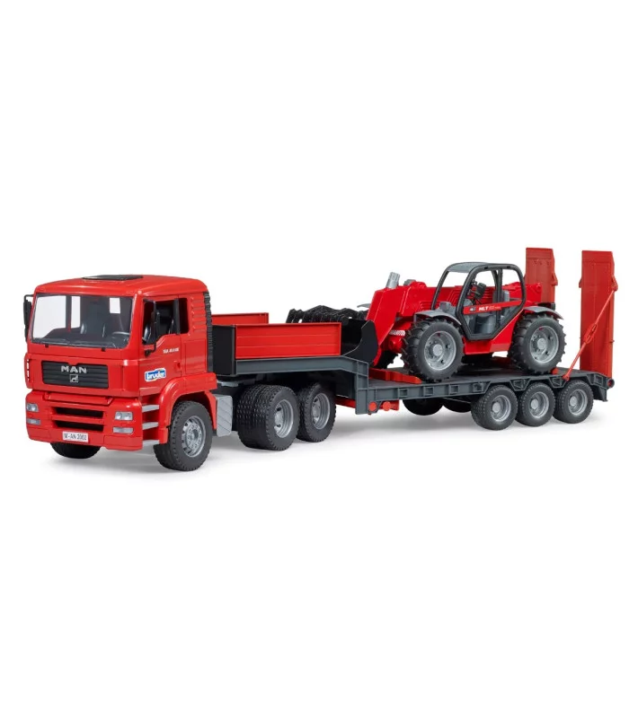 - Camion MAN TGA con rimorchio a pianale ribassato e caricatore telescopico Manitou: Questo set di giocattoli Bruder rappresenta un veicolo da trasporto pesante per il trasporto di grandi macchinari edili da un cantiere all'altro. È composto da un camion MAN TGA con rimorchio a pianale ribassato e un caricatore telescopico Manitou MT633.